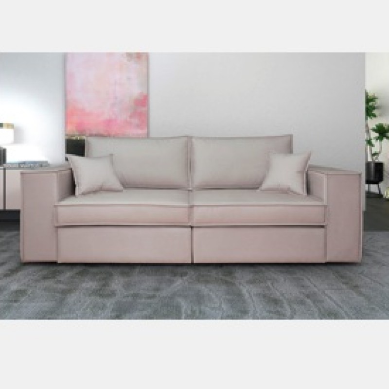 - Encosto com almofadas soltas em fibras siliconizada revestida com fibra manta 150 gr; - Assento retrátil com corrediça metálica, tirtas de mola pocket ensacada, percinta elástica e espuma D-28 soft, revestido com manta fibra 150 gr; - Estrutura em madeira tratada de eucalipto com parafusos de fixação e porca garras que facilitam a montagem e desmontagem das peças. *Disponível na opção modulado. Acompanha decorativas com tnt e fibra siliconizada.