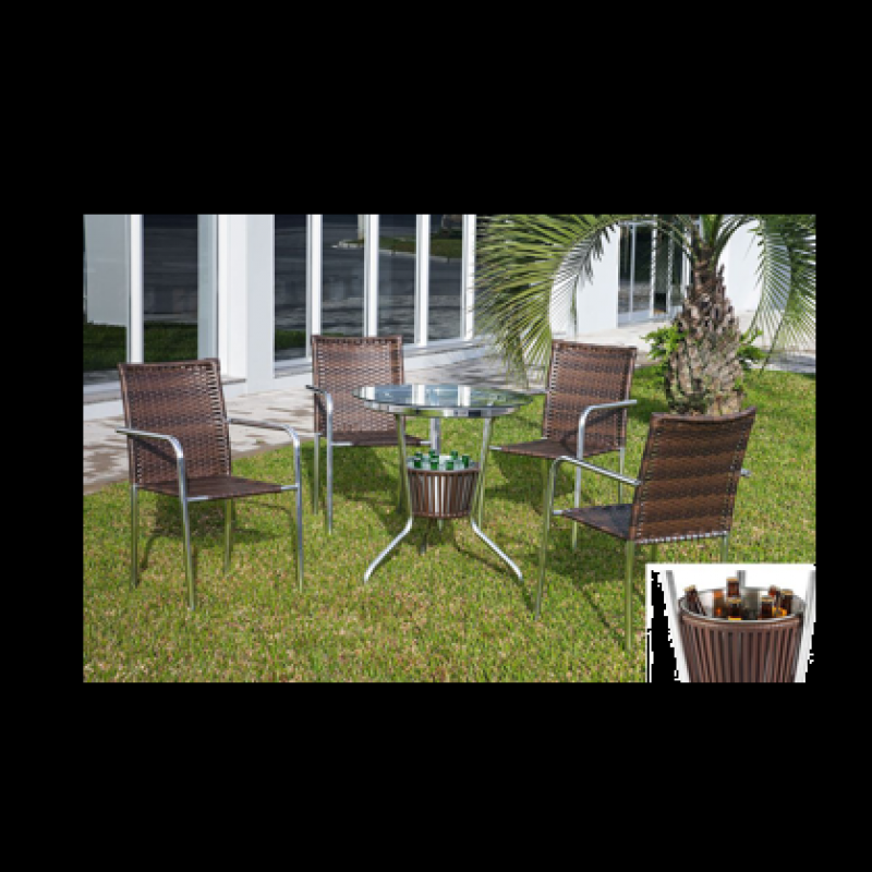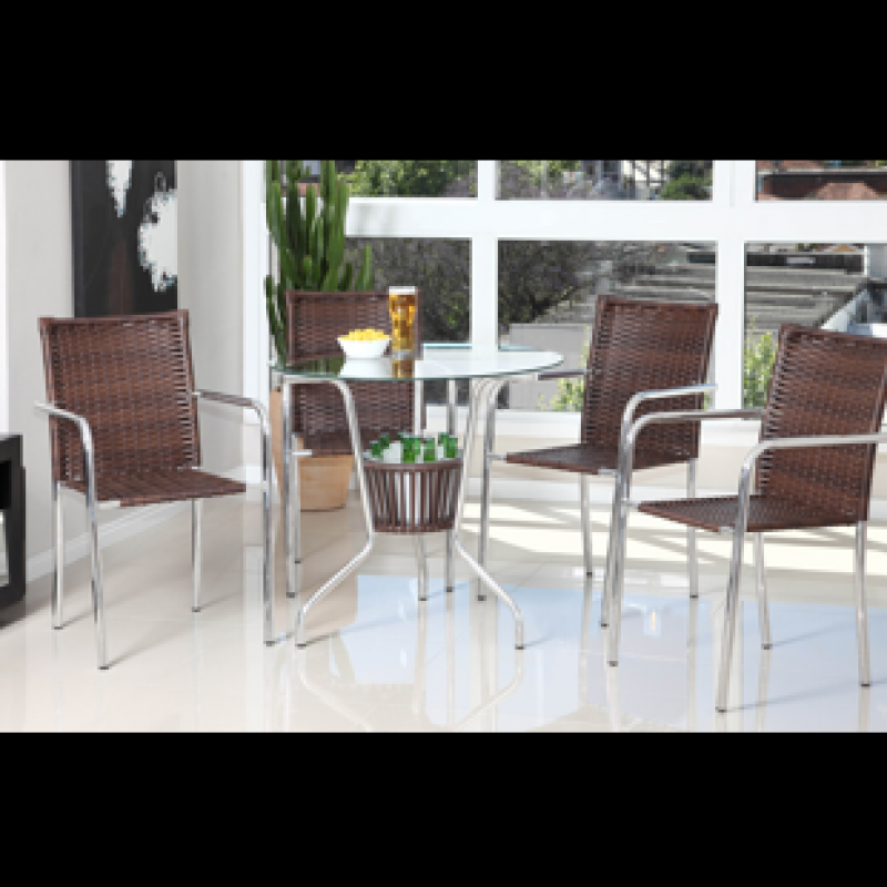 - Cadeiras com estrutura em alumínio, junco trançado importado; - Mesa com estrutura em alumínio, vidro 6mm; *Opcional baldinho.