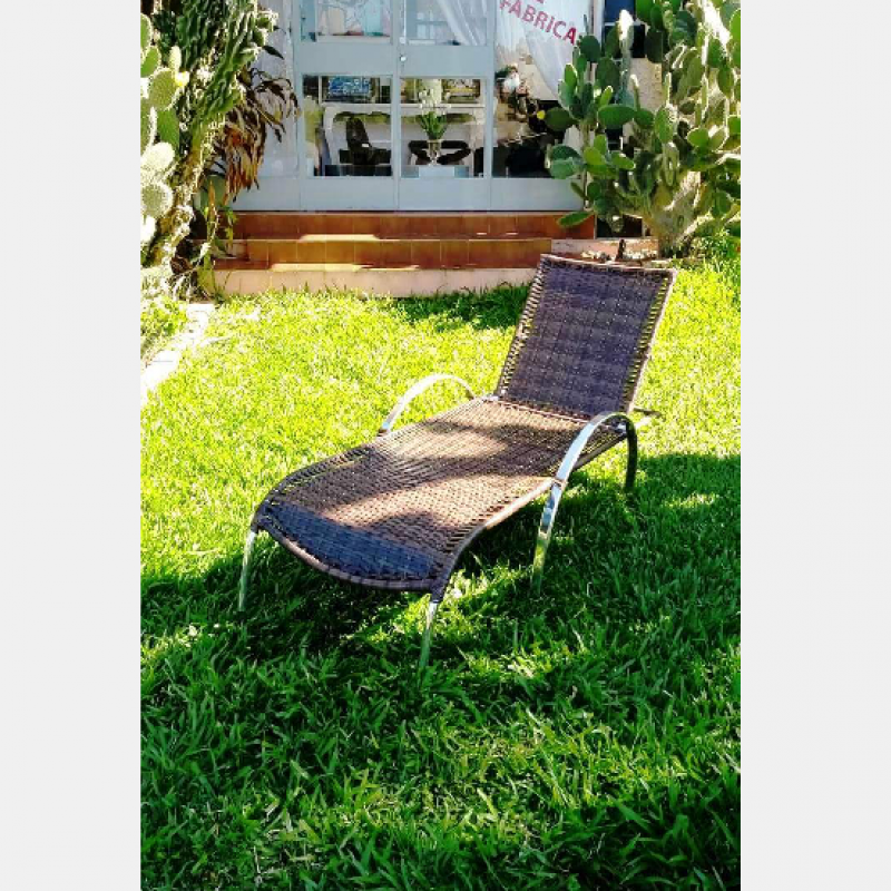 Espreguiçadeira em alumínio revestida com fibra sintética. Com trava para regulagem de altura do encosto.