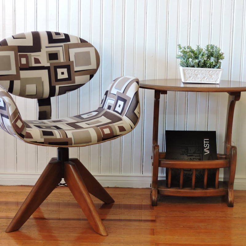 - Estrutura em madeira laminada; - Espuma 4cm, densidade 28; - Base em alumínio ou madeira giratória.